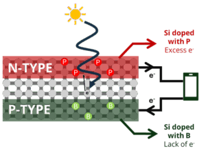 All solar panels (or photovoltaics/PVs) work by transforming light directly into usable electricity. Traditional solar cells are usually made of layers of silicon, with some atoms swapped with more or less electrons. The top layer, or ‘N-Type’, contain atoms with more electrons than silicon (e.g. phosphorus (P)). This layer is said to be electron ‘rich’, with excess electrons, so is slightly negatively charged. The bottom layer, or ‘P-type’, contains atoms with less electrons than silicon (e.g. Boron (B)). This layer is said to lack electrons so is slightly positively charged.
