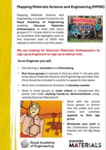 A project involving visiting schools to run focus groups to find out how 11-14 year olds best engage with STEM and then work with an illustrator to develop graphics to appeal to this age group. You will also get training in animation and film making to make videos to showcase Materials Science and Engineering to school aged children.